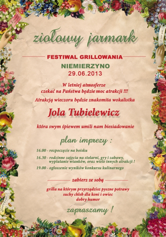 Serdecznie zapraszamy na „Jarmark wiejskich tradycji” do gospodarstwa agroturystycznego w Niemierzynie 8, w dniu 26 maja 2013r. na godz. 15.00 – wymiana sadzonek, nasion roślin wieloletnich i jednorocznych – małe rękodzieło – poczęstunek i zabawa Zapraszamy Stowarzyszenie „ Z tradycją w przyszłość”